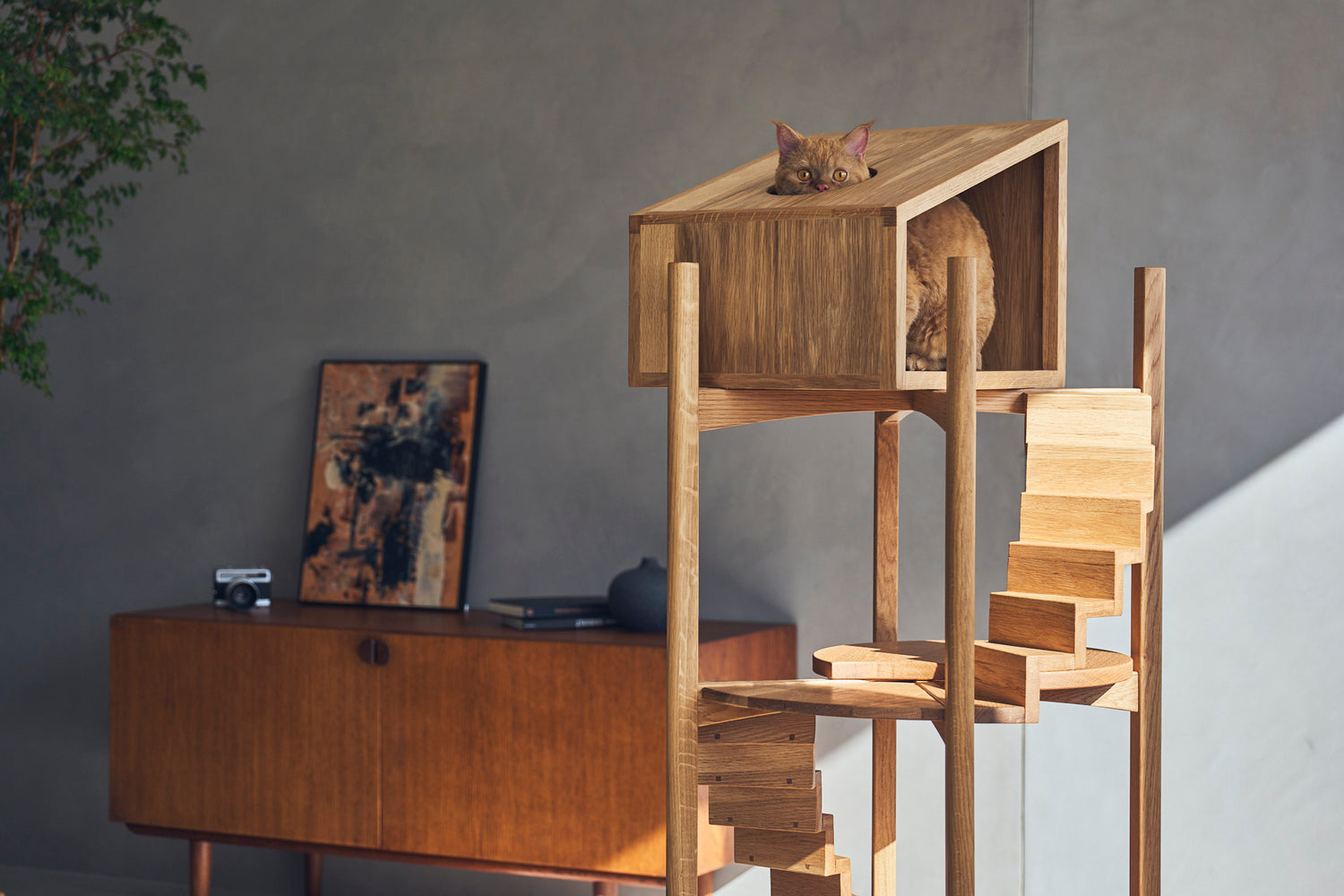 猫が猫らしく、気の向くまま、 自由に過ごせるとっておきの場所。 猫にとってどんな時も心地よく家族の気分までも高めるプロダクトを目指して、 本能的に満たされる仕組みとともに、見た目の美しさと耐久性にこだわったキャットツリーハウスを制作しました。