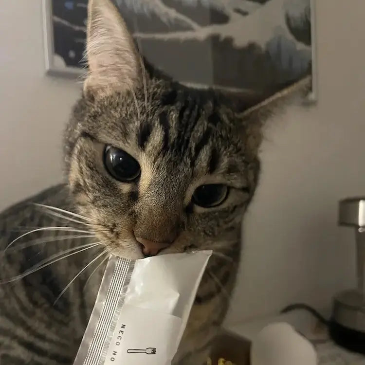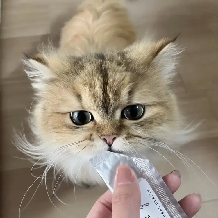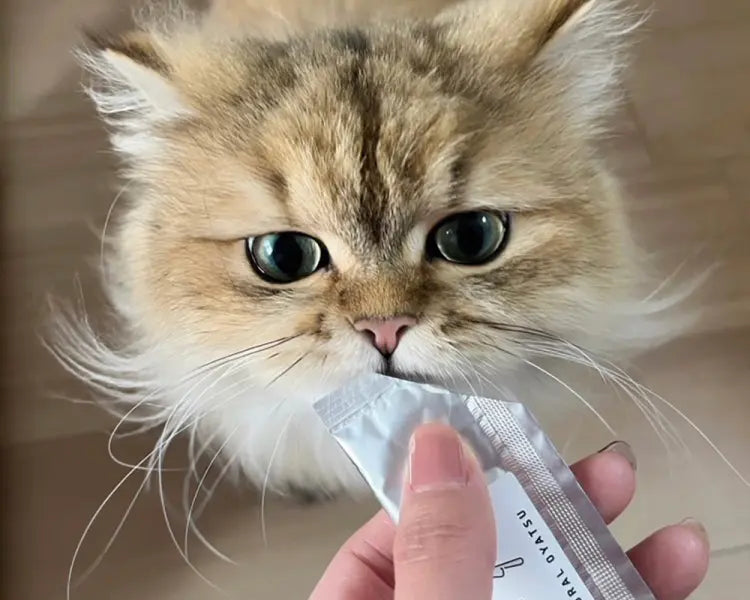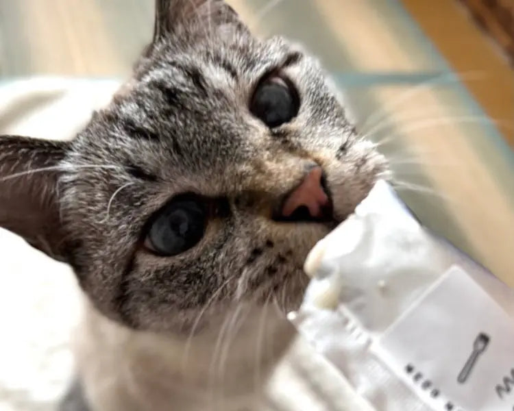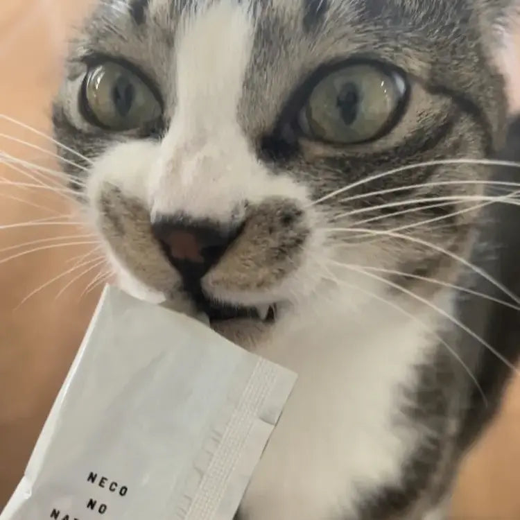 - (標準的な成猫で)1回につき1~2袋、1日につき2~3回を目安にオヤツとして、または手作りご飯や総合栄養食と一緒にお与えください。
